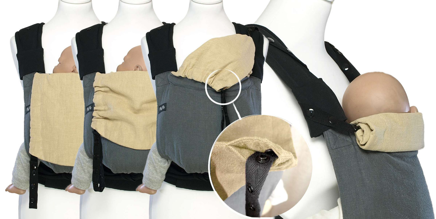 Die Kopfstütze ist ein wichtiger Teil deiner MaMo. Sie hält das Köpfchen, wenn es dein Baby noch nicht selber kann. Oder dein Baby schläft ein und braucht dann den Halt. Die Kopfstütze wird über Druckknöpfe mit dem Beutel verbunden und oben an die Träger geknöpft. Die vielseitigen Möglichkeiten stellen sicher, daß der Kopf immer stabil dund sicher gestützt werden kann - so hast du wirklich die Hände frei.
